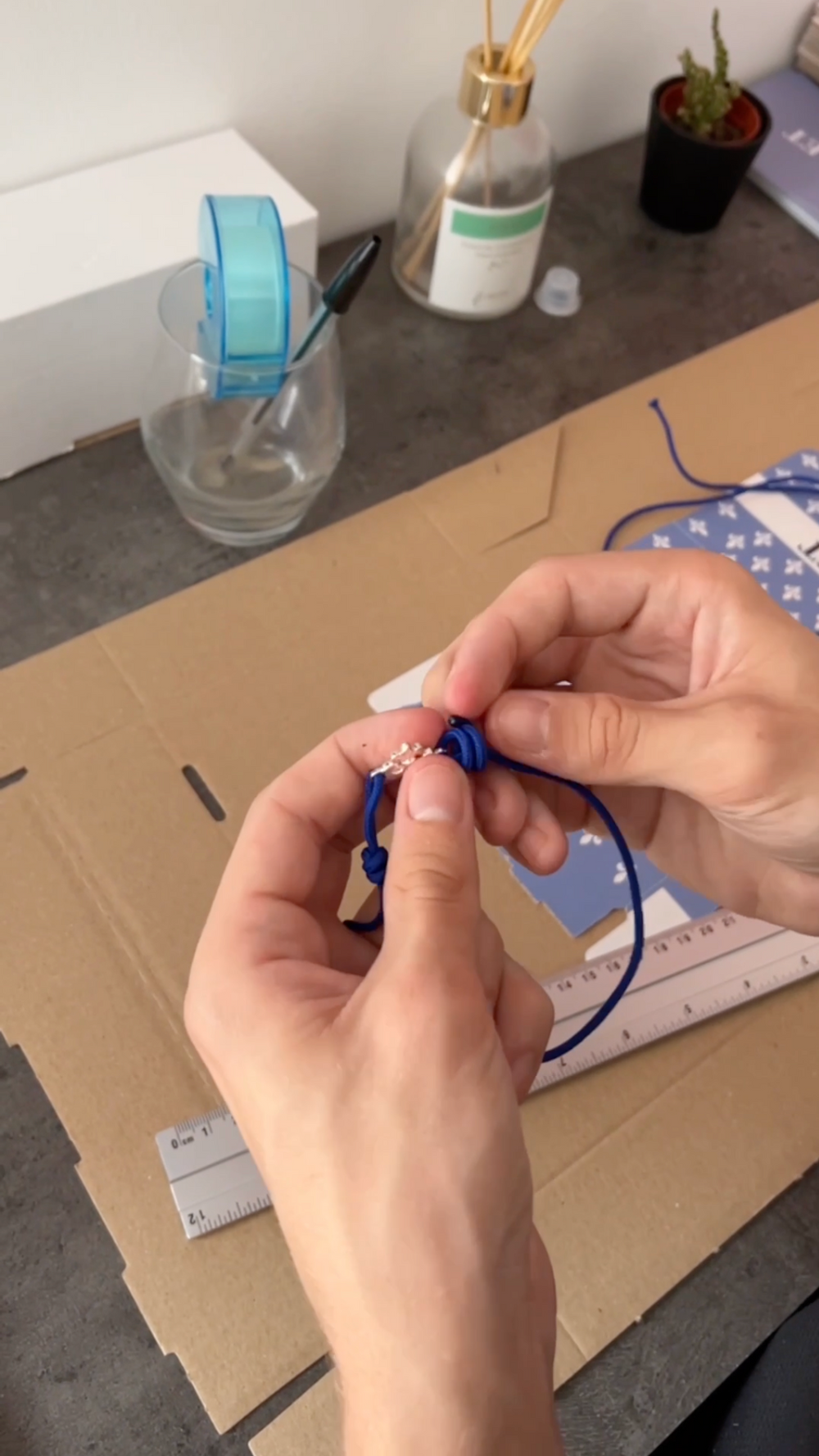 Chaque bracelet est assemblé par nos soins. Nous utilisons un nœud coulissant, associé à différentes techniques d’assemblage, afin d’assurer confort, solidité et ajustement parfait au poignet.